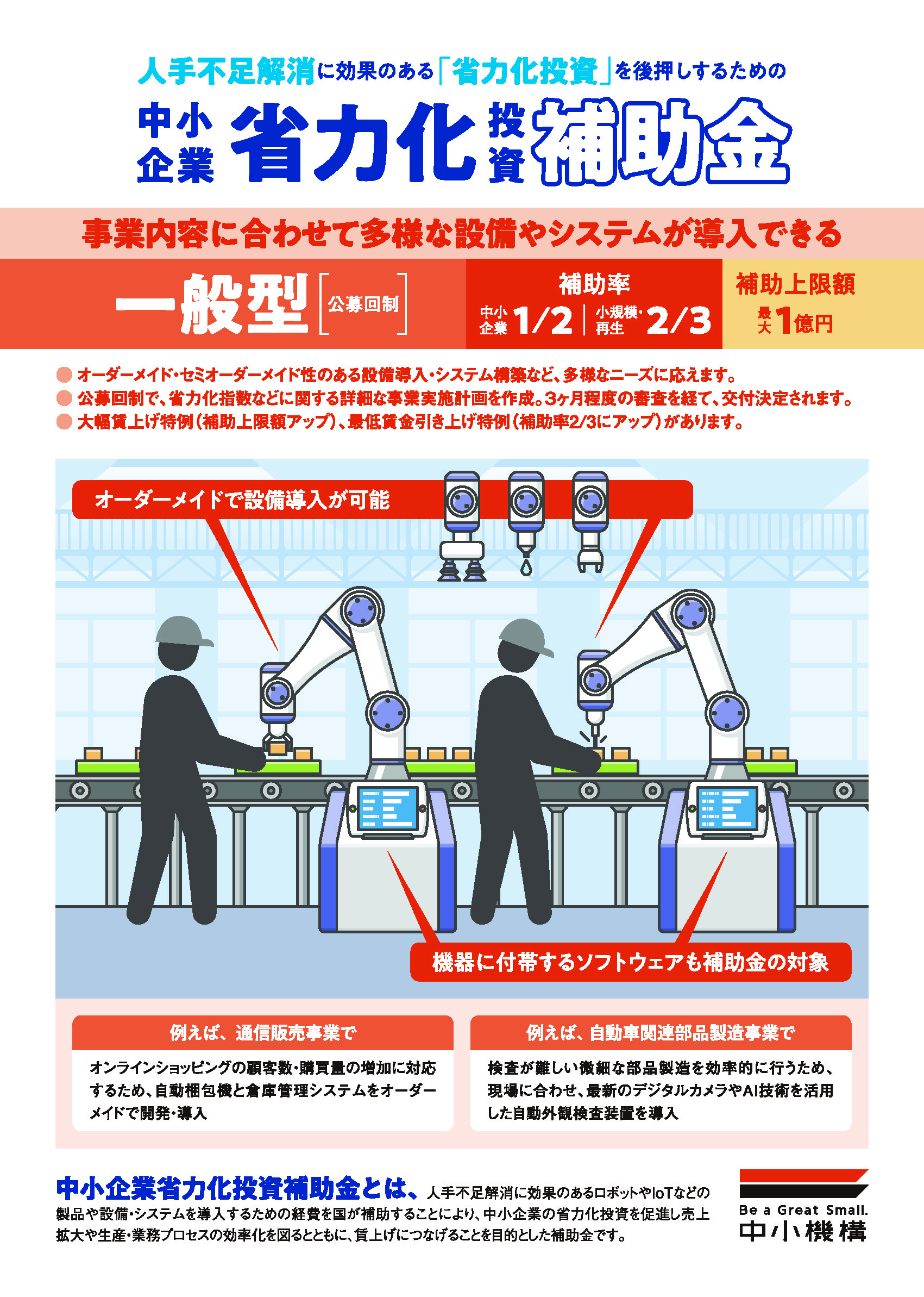 この補助金の目的は、中小企業等の売上拡大や生産性向上を後押しするため、人手不足に悩む中小企業等が、IoT・ロボット等の人手不足解消に効果があるデジタル技術等を活用した設備を導入するための事業費等の経費の一部を補助することにより、省力化投資を促進します。これにより、中小企業等の付加価値額や生産性向上を図り、賃上げにつなげることを目的とします。制度の概要は次の通りです。