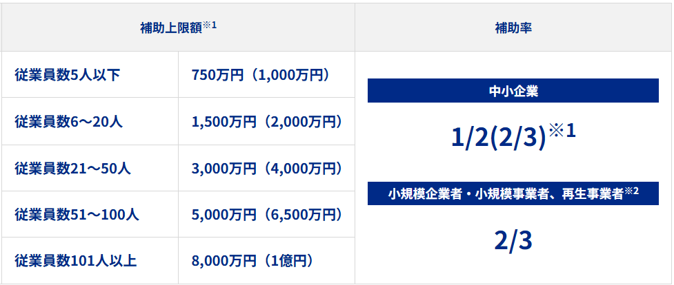 補助金額は従業員数によって上限が変わります。